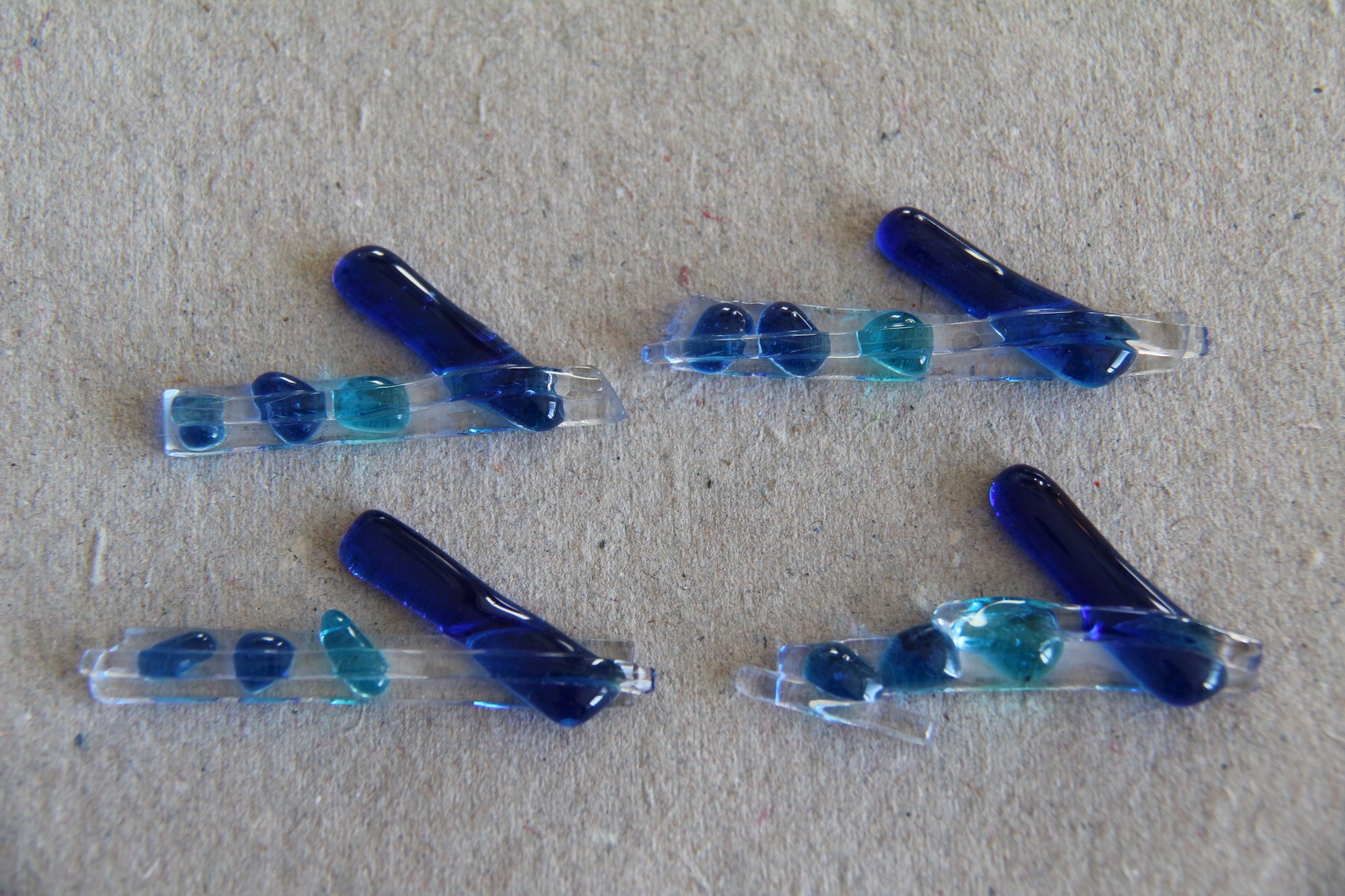 To-strenget klart glas og klart blå glas med pynt af klar blå. Max. 6×4 cm.