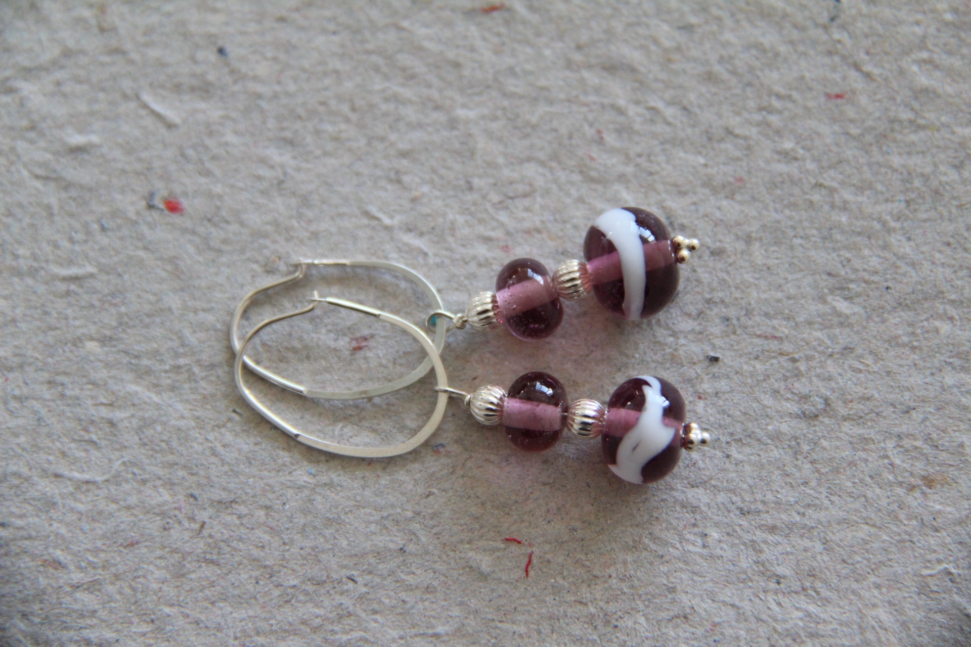 Perler i klar lilla og klar lilla med hvid streg og mellemperler af sterling sølv.