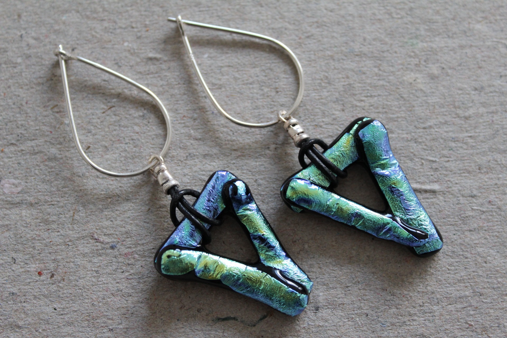 Trekant i glimtende lyse gul-grøn-blålige nuancer hængt på dråbeformet creol i sterling sølv, 925 med lædersnøre.