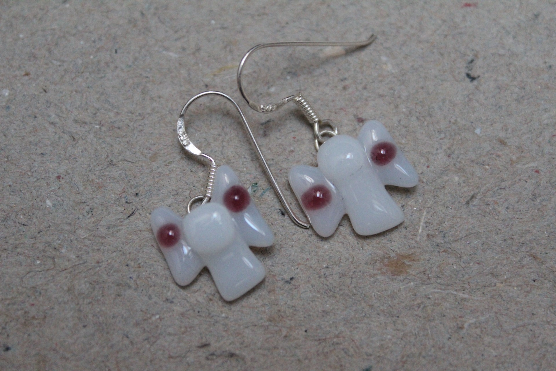 Engle i hvid med rød pynt på ørekrog i sterling sølv, ca. 1 cm.