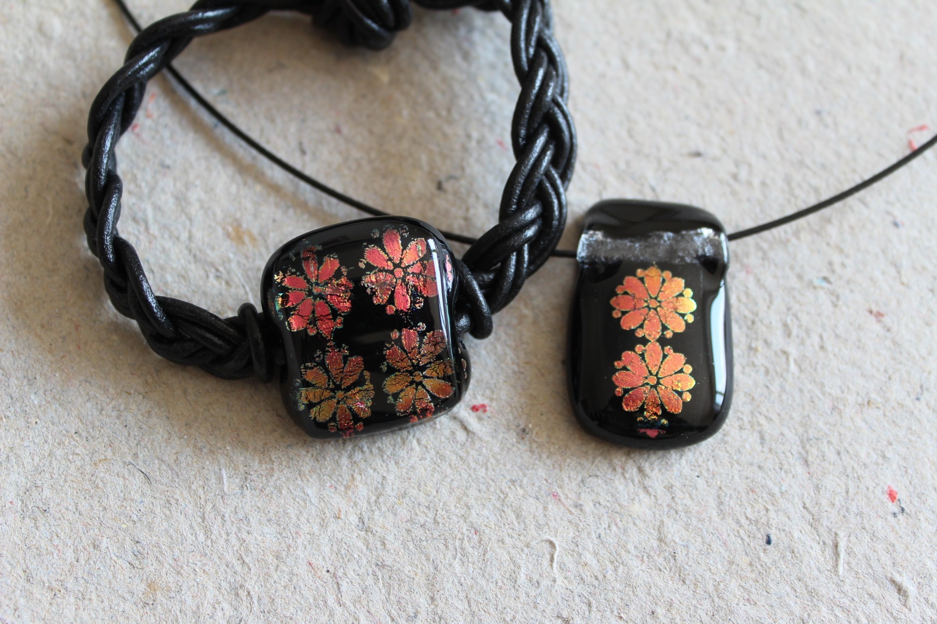 Smykkepynt: Glas med glimtende røde blomster på sort bund