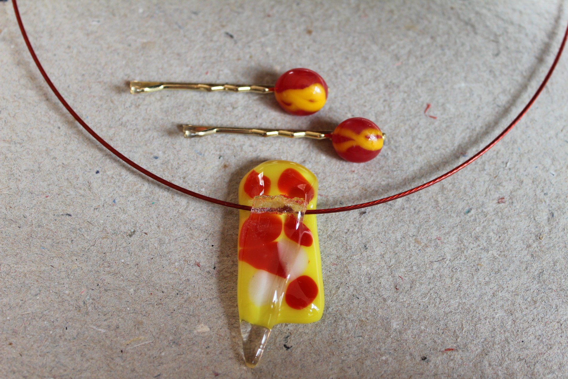 Smykkepynt: Glas med rødt og hvidt mønster på gul bund