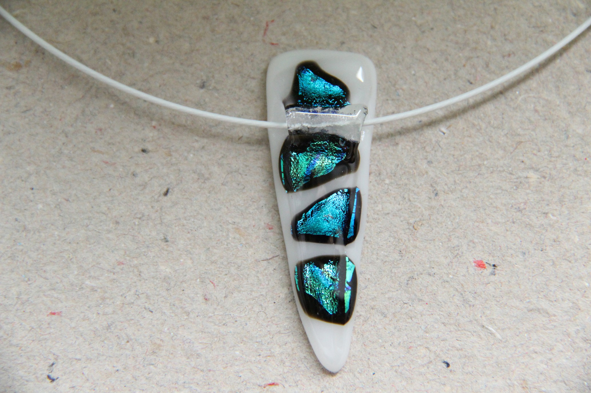 Hvid halswire, glassmykke i hvid med glimtende blå og grønne nuancer sort bund.