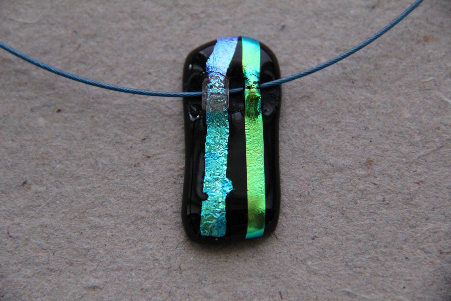 Turkis halswire, glassmykke med glimtende turkis og lys grøn stribe på sort bund.