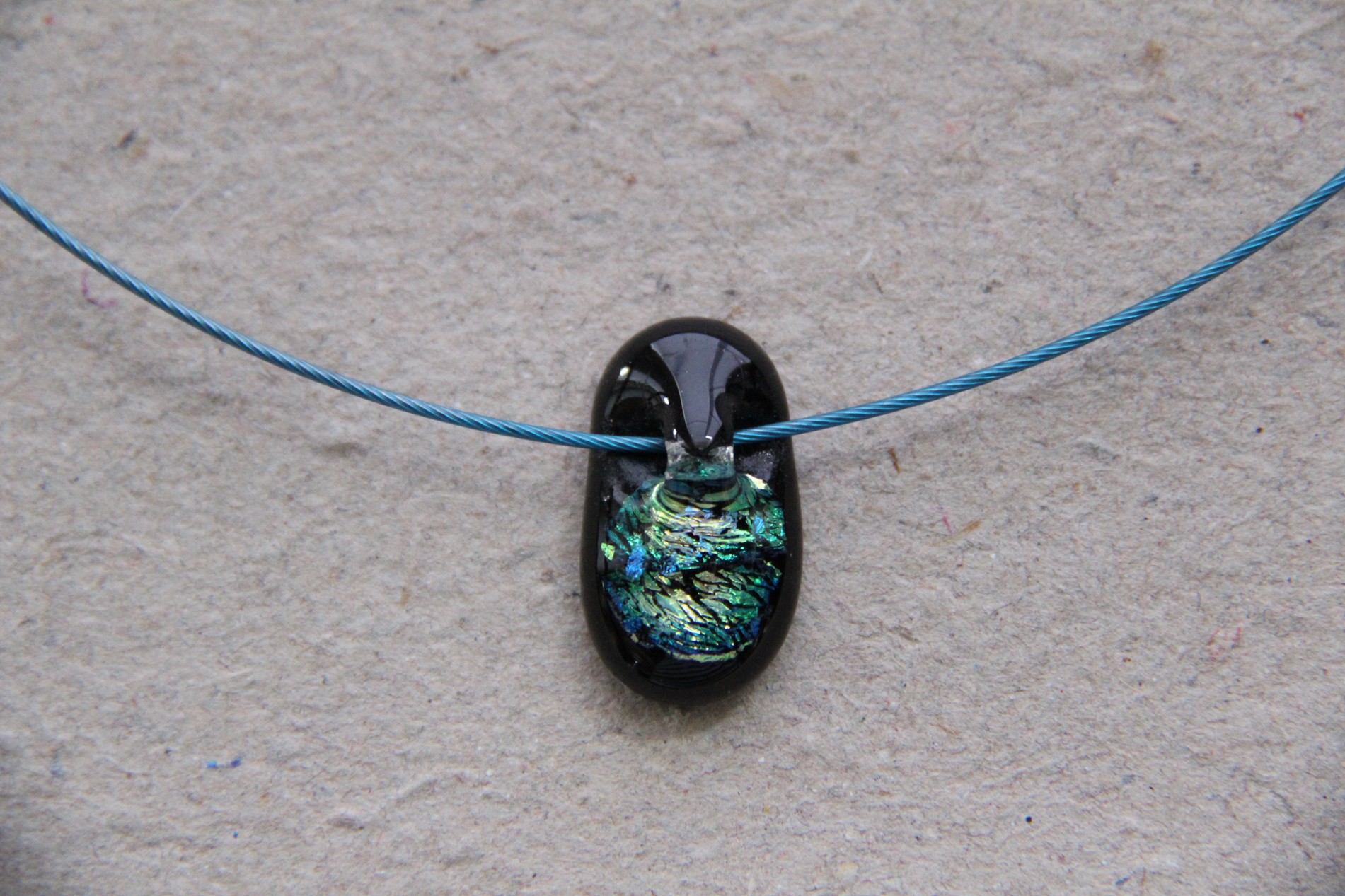 Turkis halswire, lille glassmykke med glimtende guldfarvet og blå og grønne nuancer på sort bund.