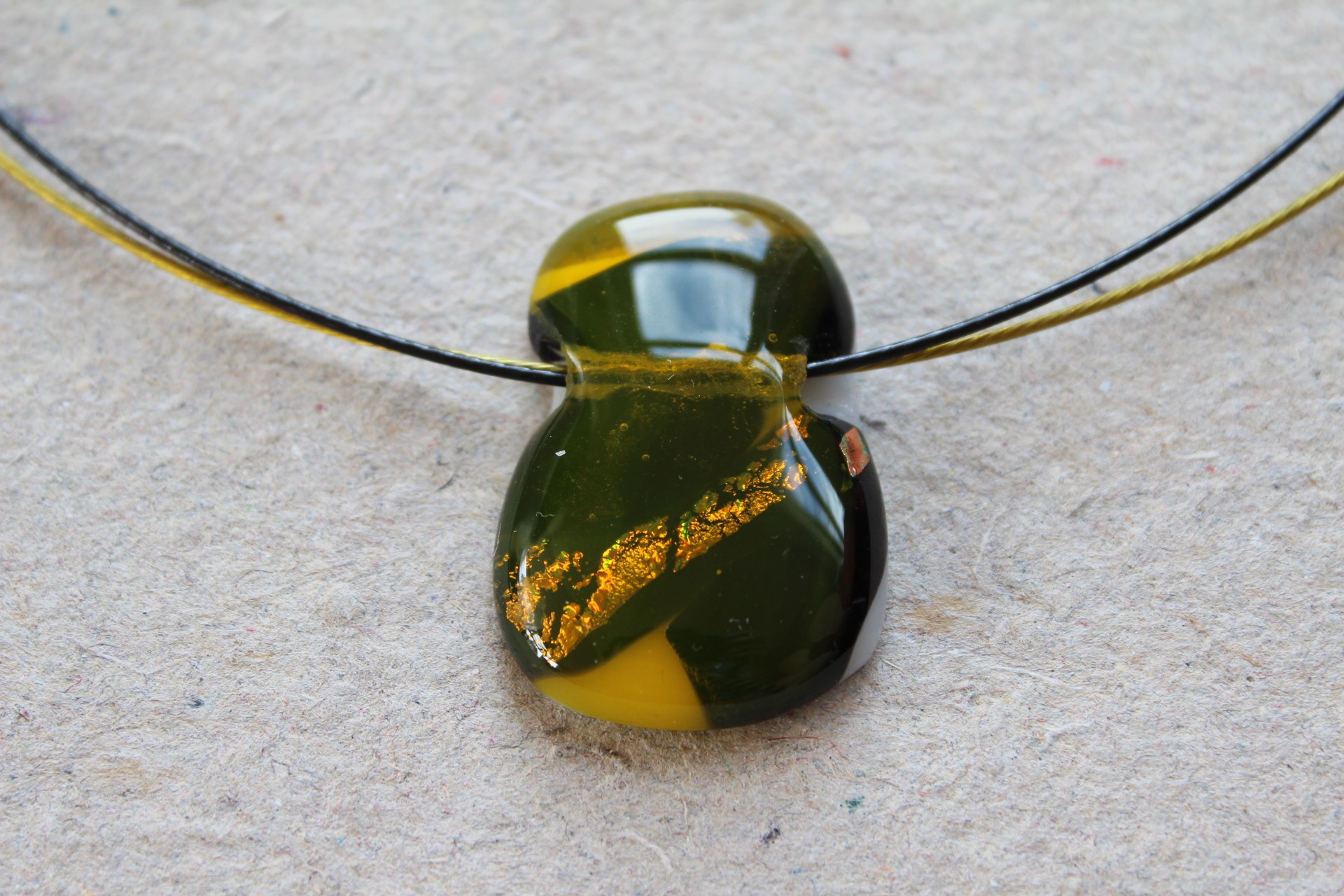 Sort og karrygul halswire, glassmykket med sort bund og glimtende kobber overtrukket med klart gult glas.