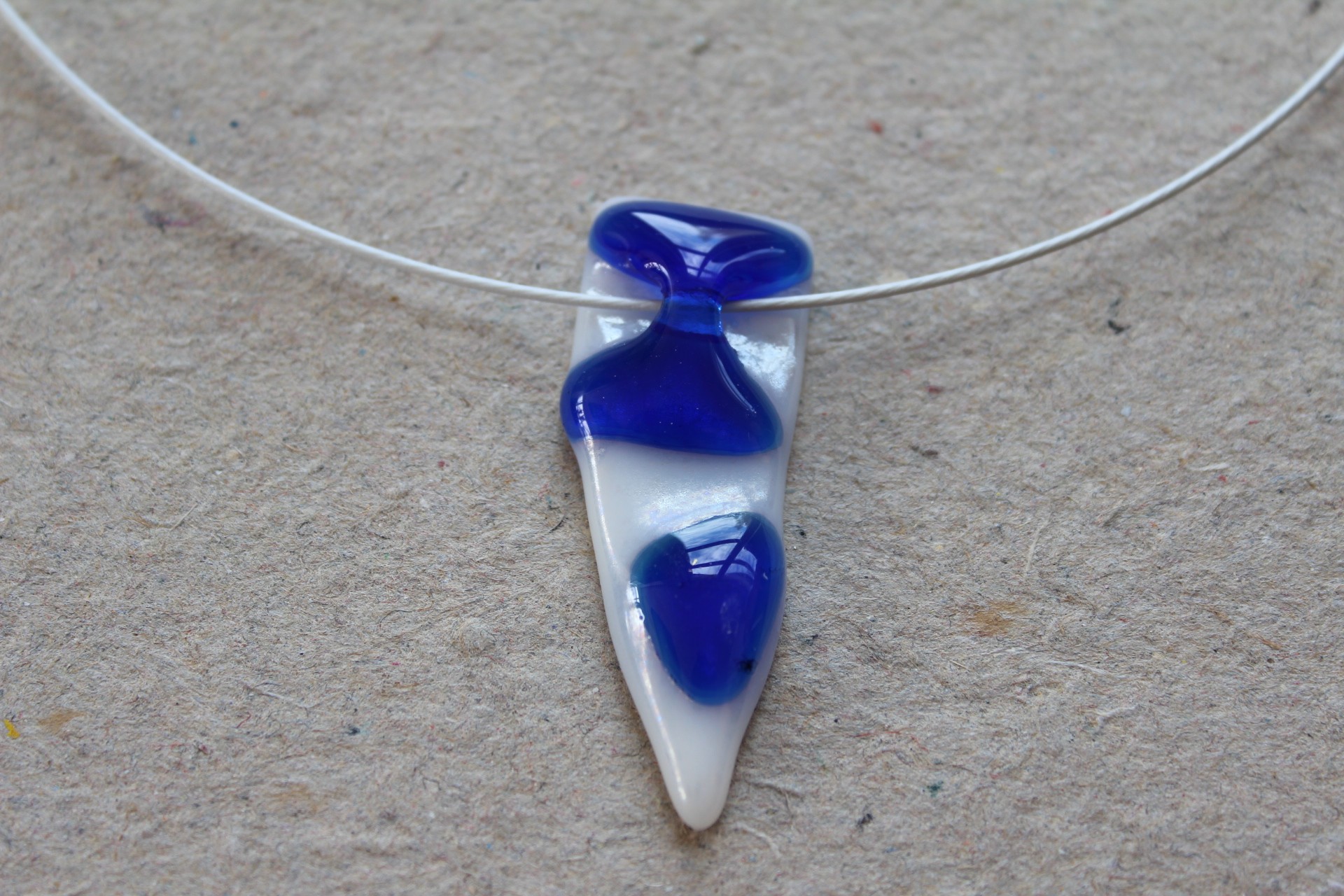Hvid halswire, glassmykke med trekant effekt i let klar koboltblå på hvid bund med let skin.
