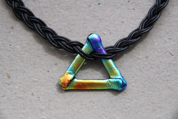 Dobbelt-flettet sort, 53 cm. Glassmykke i trekant med glimtende blå, grønne, gul og orange nuancer.