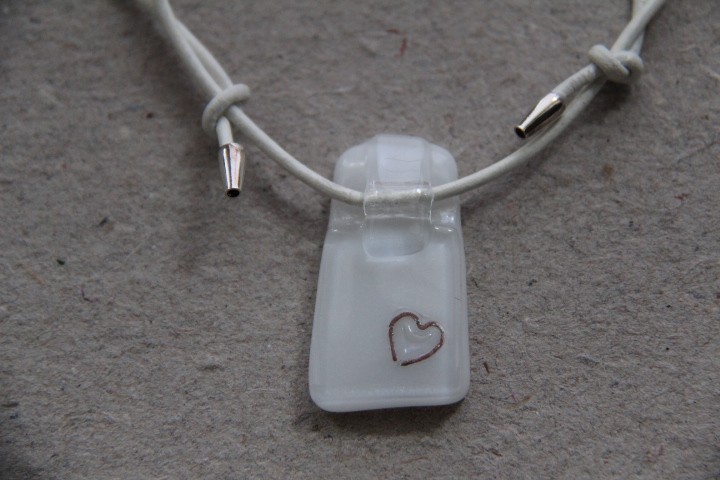Hvid med endedupper i sterling sølv, max. 60 cm. Glassmykke med indsmeltet 14 kt. guldhjerte i klar glas på hvid bund.