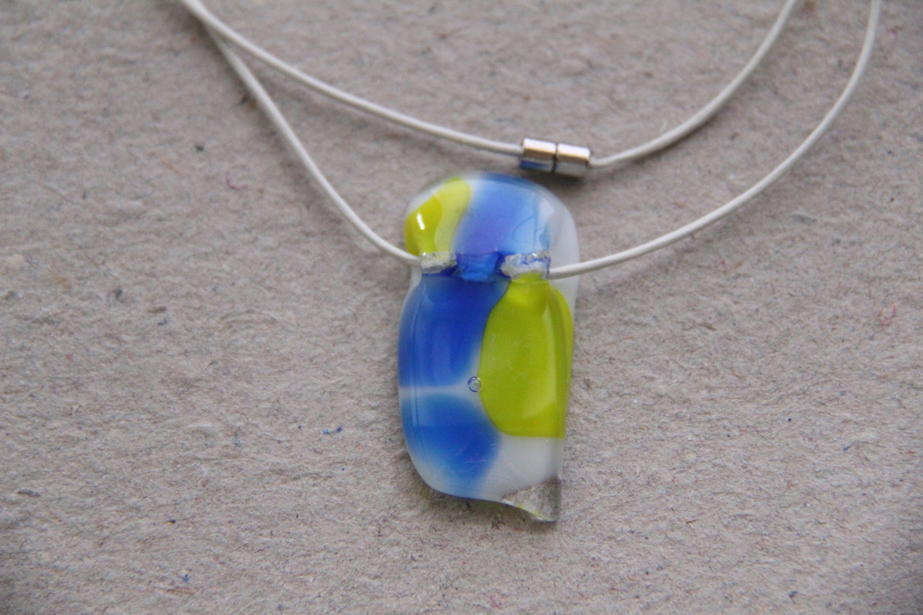Hvid, 56 cm. Glassmykke med klar glas i l og limegrøn og lys koboltblå på hvid bund.