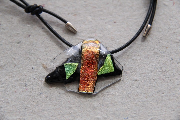 Sort med endedupper i sterling sølv, max. 75 cm. Glassmykke med glimtende orange, gul og grøn under klart glas på sort bund.