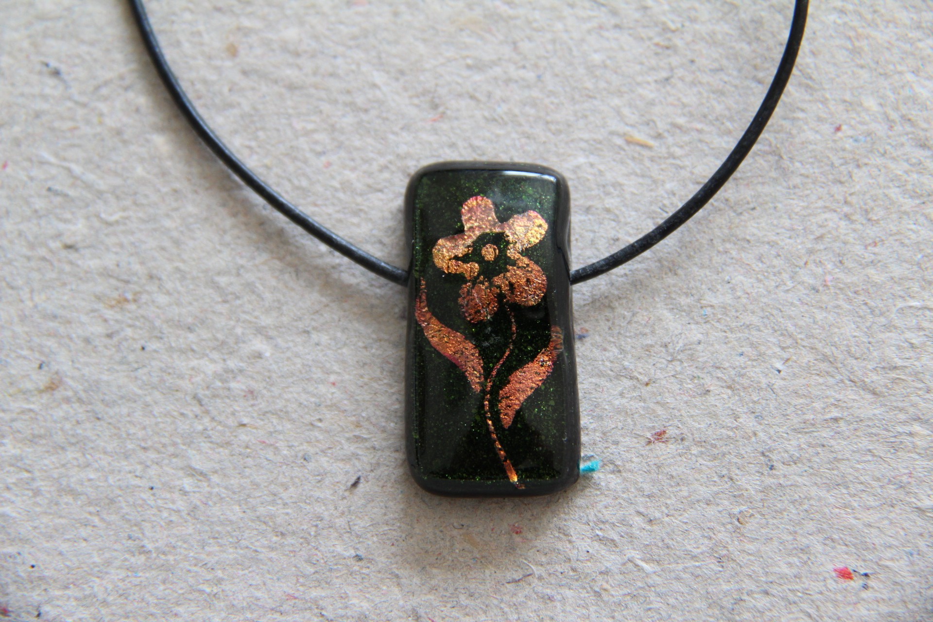 Sort lædersnøre, ca. 45 cm. Glassmykke med glimtende lys kobber og orange blomst på glimtende mørk grøn bund.