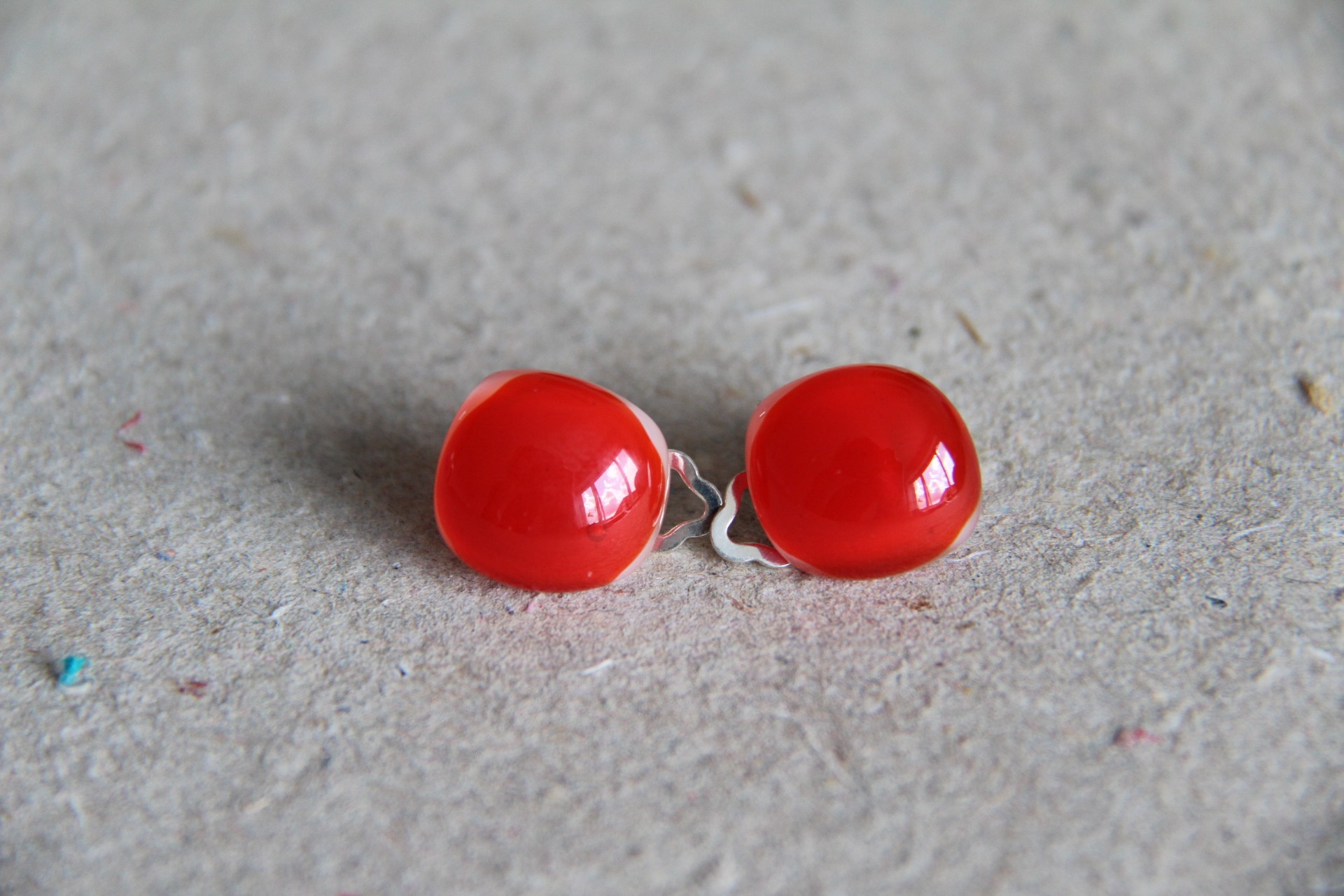 Klart rødt glas på hvid bund, øreclip i sterling sølv