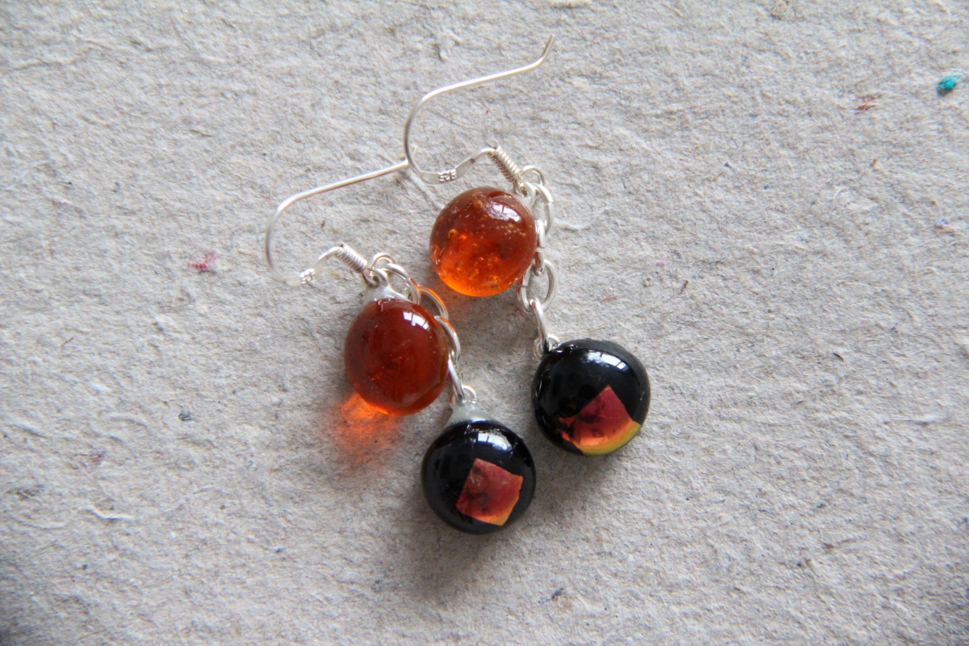 Klar rav og bronze og guldig firkant på sort bund, ørekroge i sterling sølv.