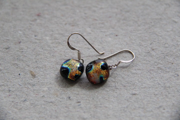 Glimtende orange med sorte områder omgivet af gul, grøn og blå kant med klar glas, ørekroge i sterling sølv.