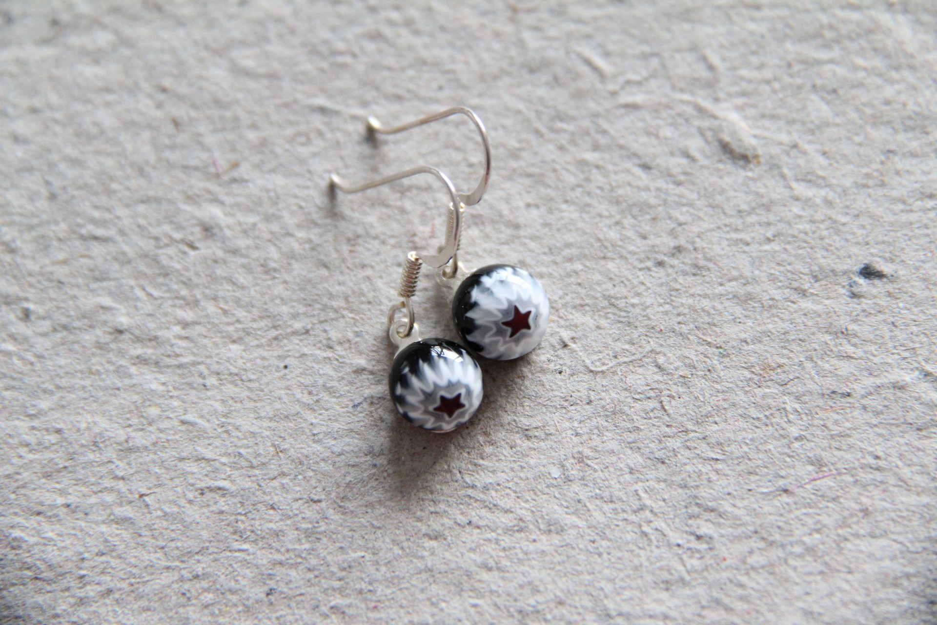 Stjerne i rød med udtrækninger i grå og hvid på sort bund, ørekroge i sterling sølv.