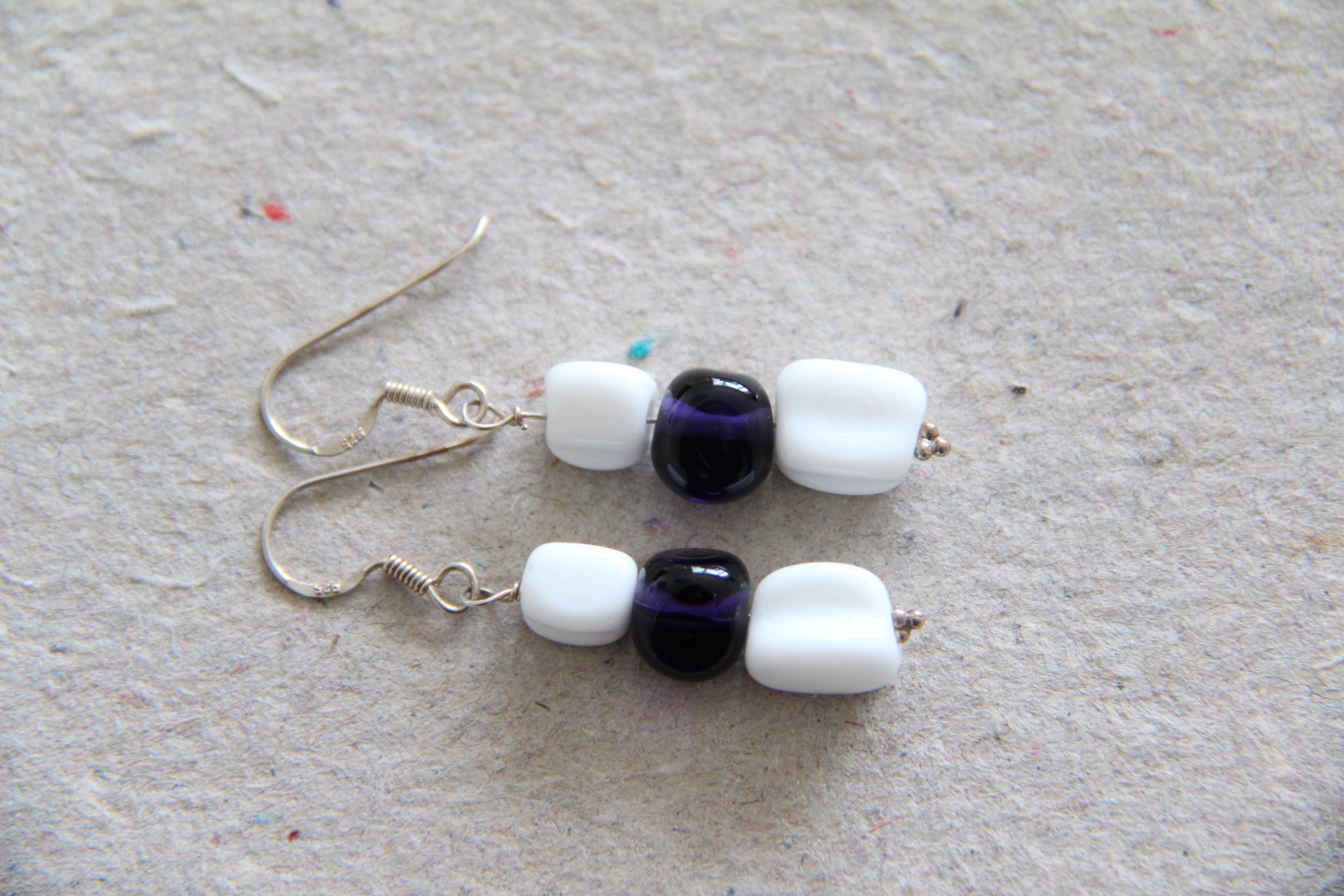 Tre trekantede og firkantede perler i hvid og mørk klar lilla.