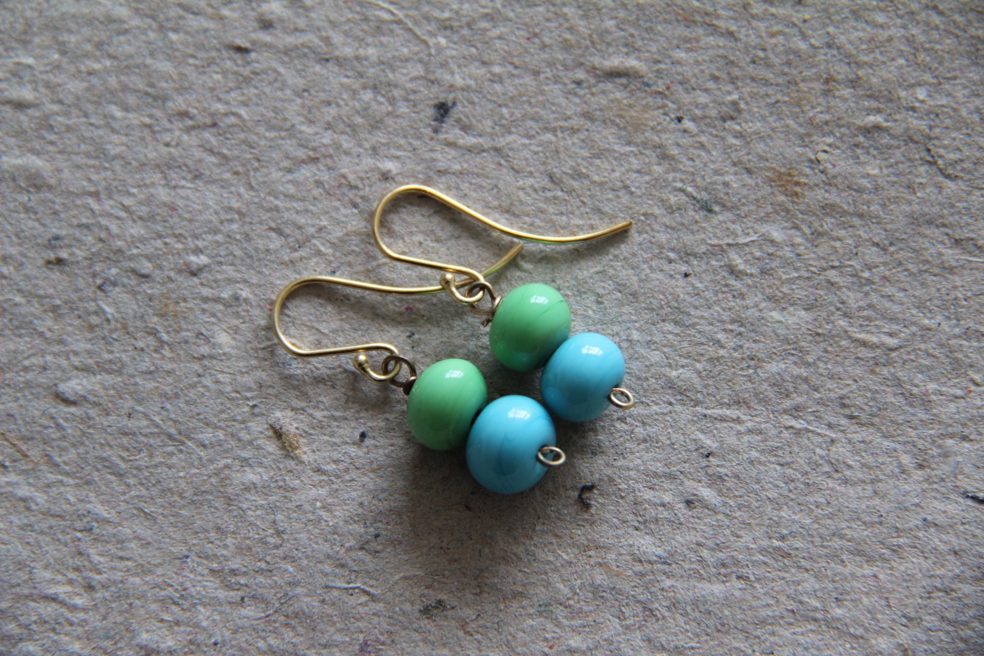 Ørekrog belagt med finguld. To perler i ærtegrøn og himmelblå.