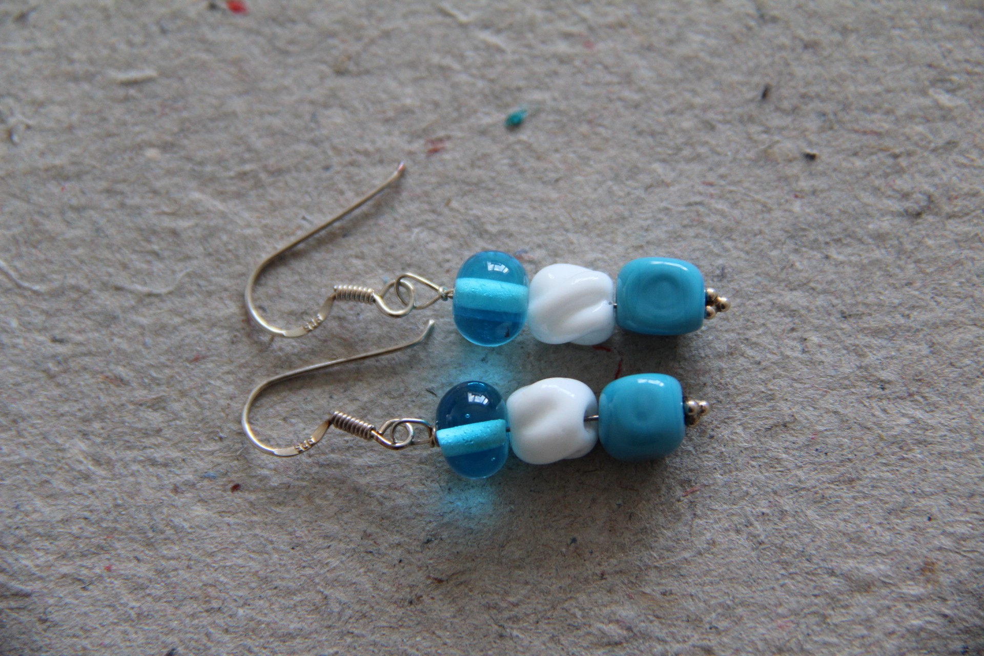Tre perler klar lys blå, hvid med riller og lys blå i firkant, ørekroge i sterling sølv.