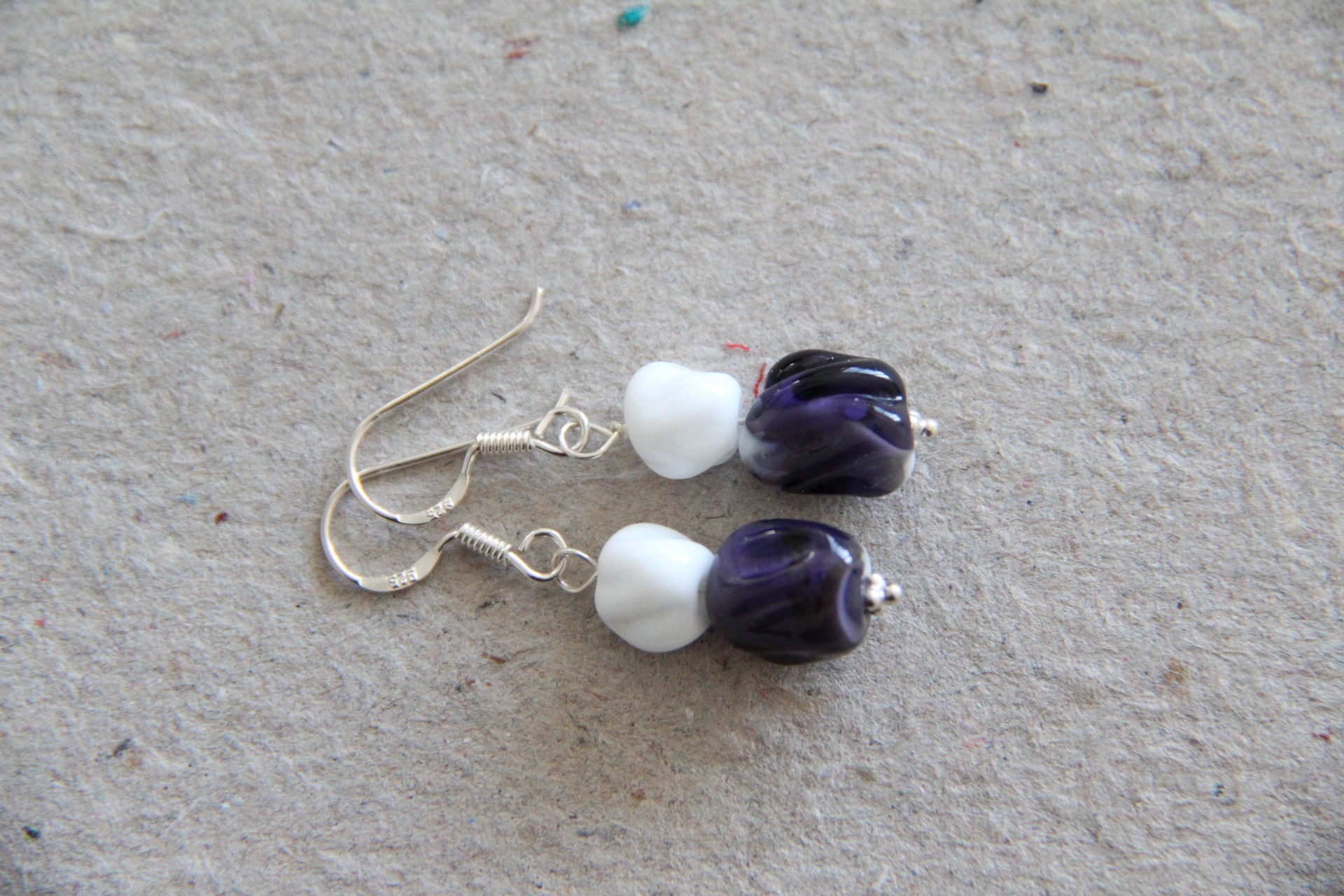 To perler i hvid og klar mørk lilla over hvid med riller, ørekroge i sterling sølv.