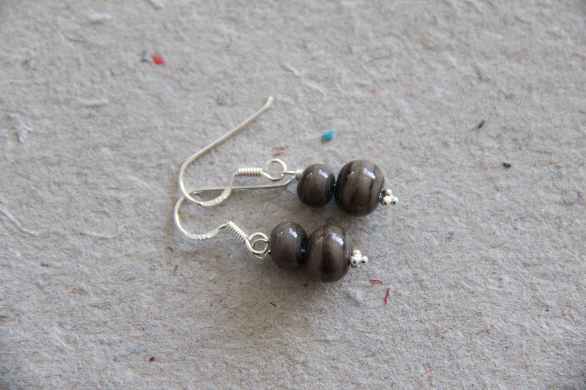 To perler i grå og brune nuancer med et strejf blå og med stribeeffekt, ørekroge i sterling sølv.