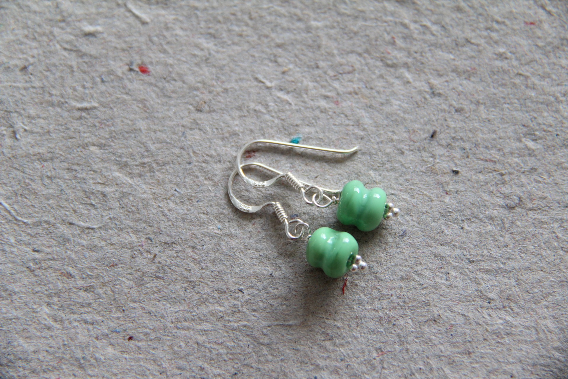 Perle i ærtegrøn med rille på tværs, ørekroge i sterling sølv.