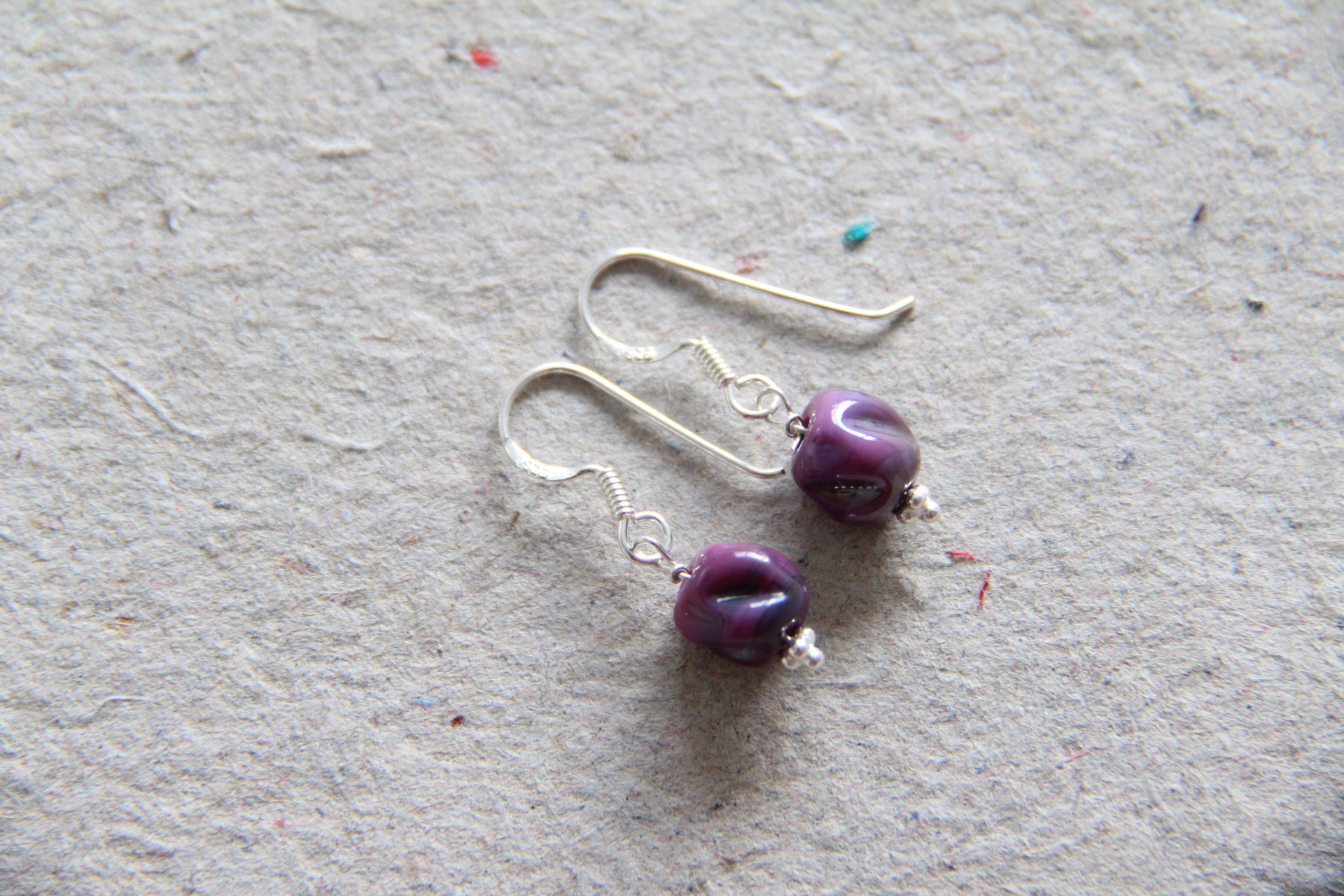 Perle med riller i lavendel og lilla med mørke stribeeffekter, ørekroge i sterling sølv.