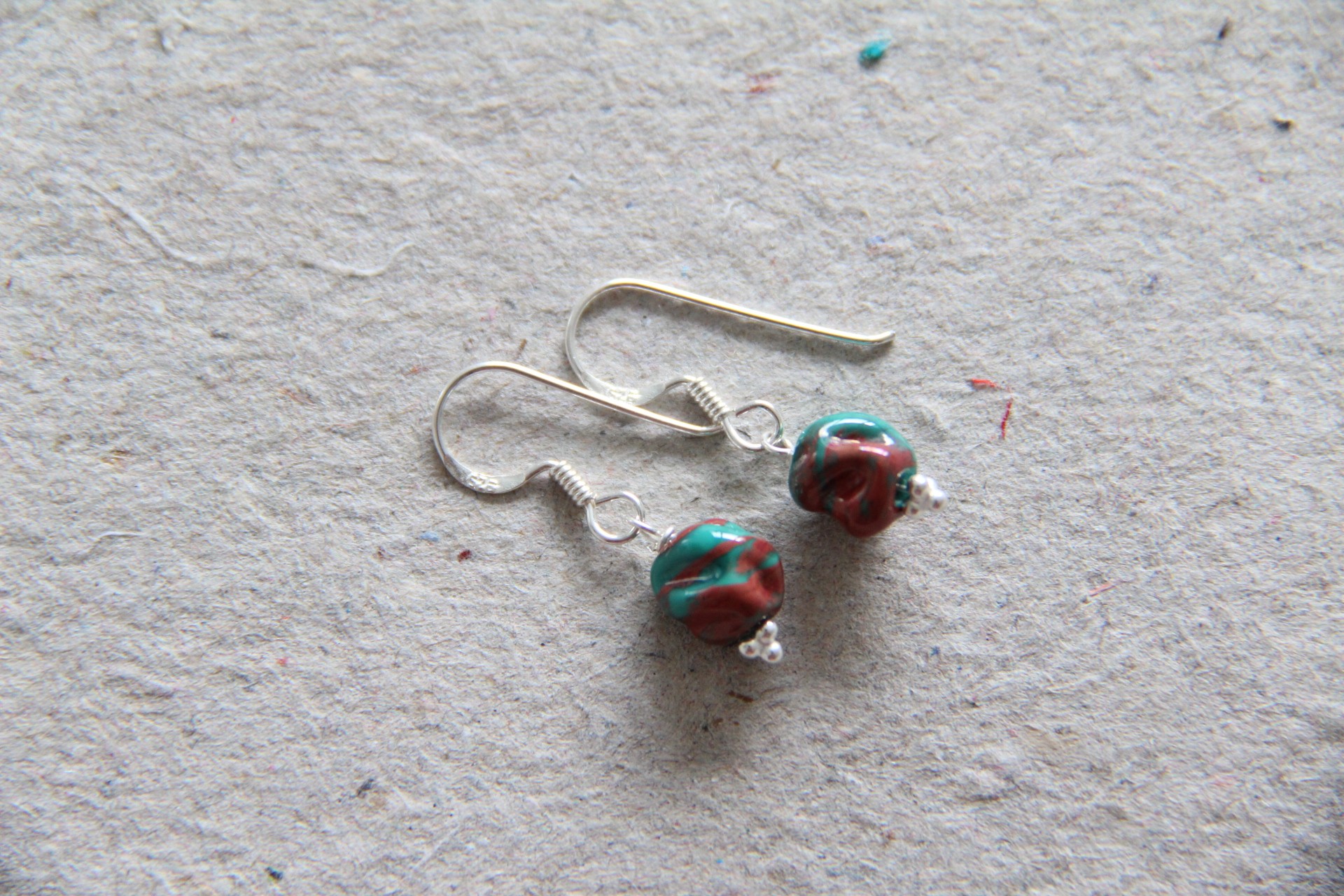 Perle med riller i grøn og blå med aftagninger i rustrød, ørekroge i sterling sølv.