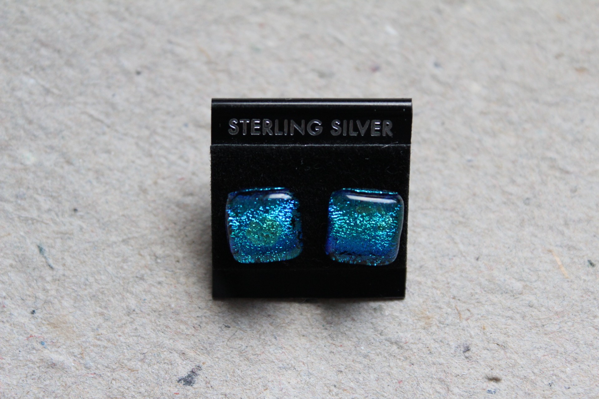 Glimtende og changerende i lys blå nuancer med klar glas, ørestikker i sterling sølv.