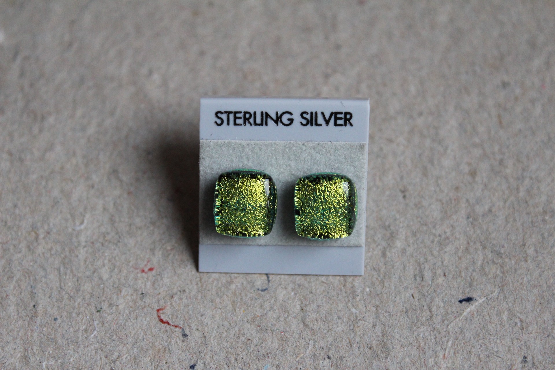 Glimtende gul med klar glas, ørestikker i sterling sølv.