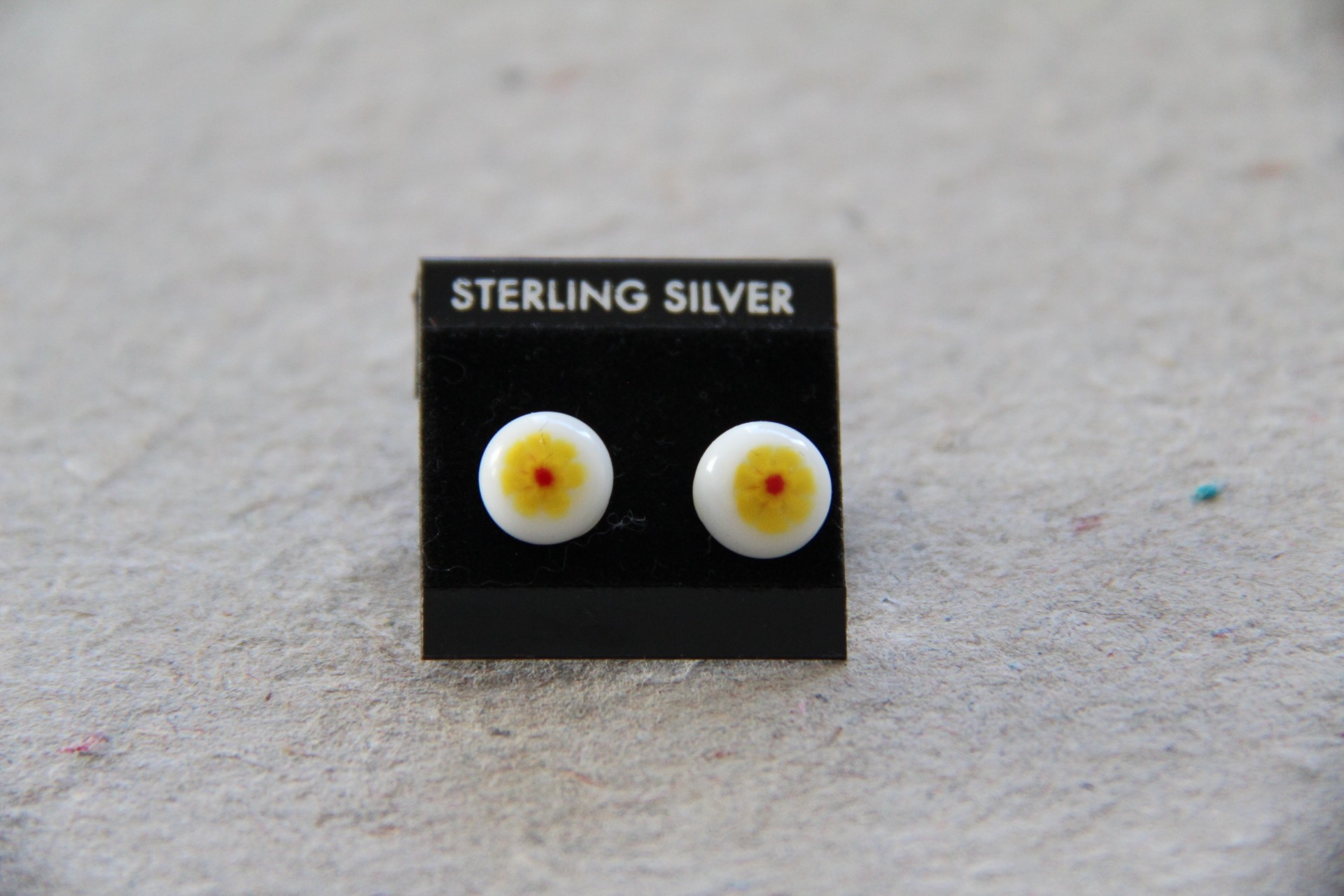 Gul blomst med rød midte på hvid bund, ørestikker i sterling sølv