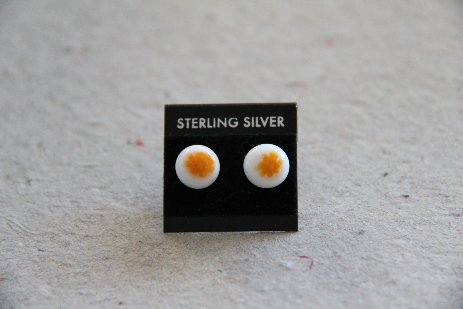 Orange blomst på hvid bund, ørestikker i sterling sølv