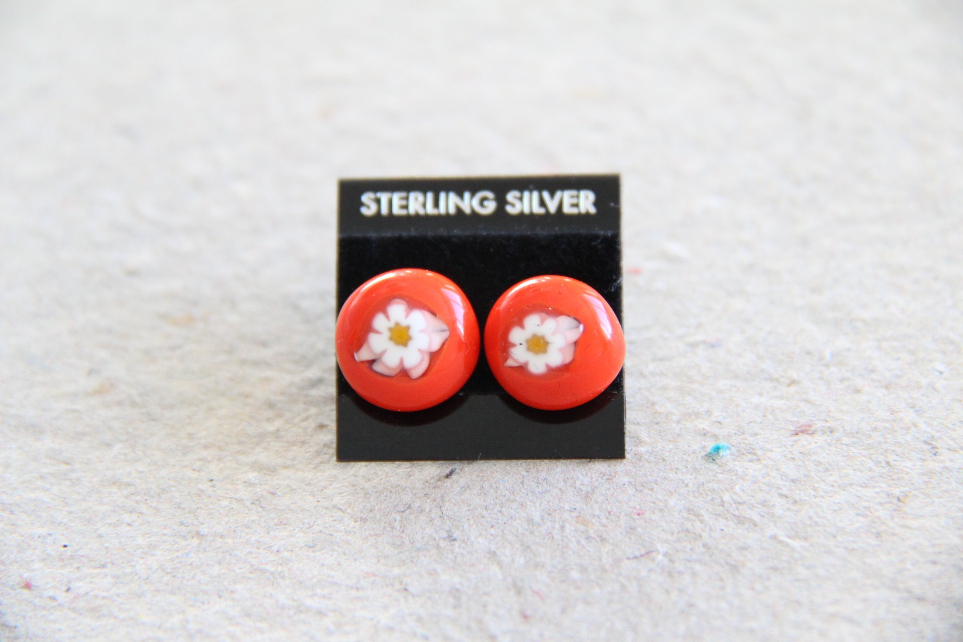 Blomst i hvid, lys rød og solsikkegul på orange bund, ørestikker i sterling sølv