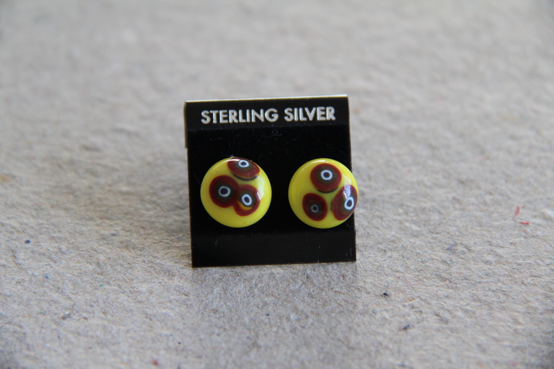 Cirkelmønster i rødbrun, brun, sort og hvid på gul bund, ørestikker i sterling sølv