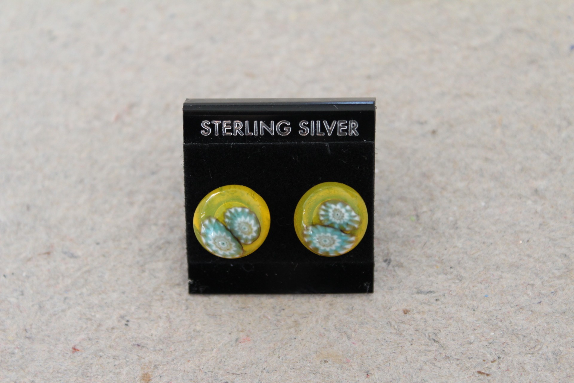 Mønster i lys brun, lys blå og hvid på bund af klar gul, ørestikker i sterling sølv