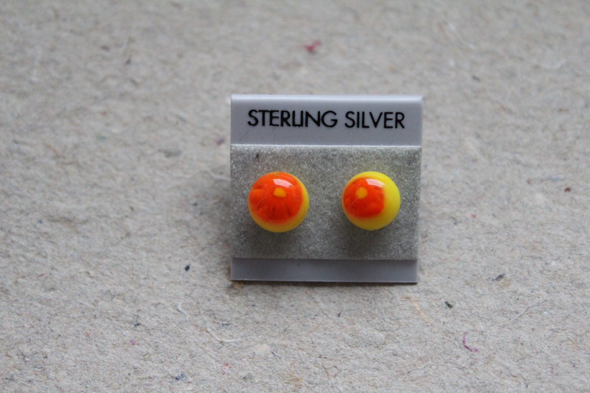 Blomst i orange på gul bund, ørestikker i sterling sølv.