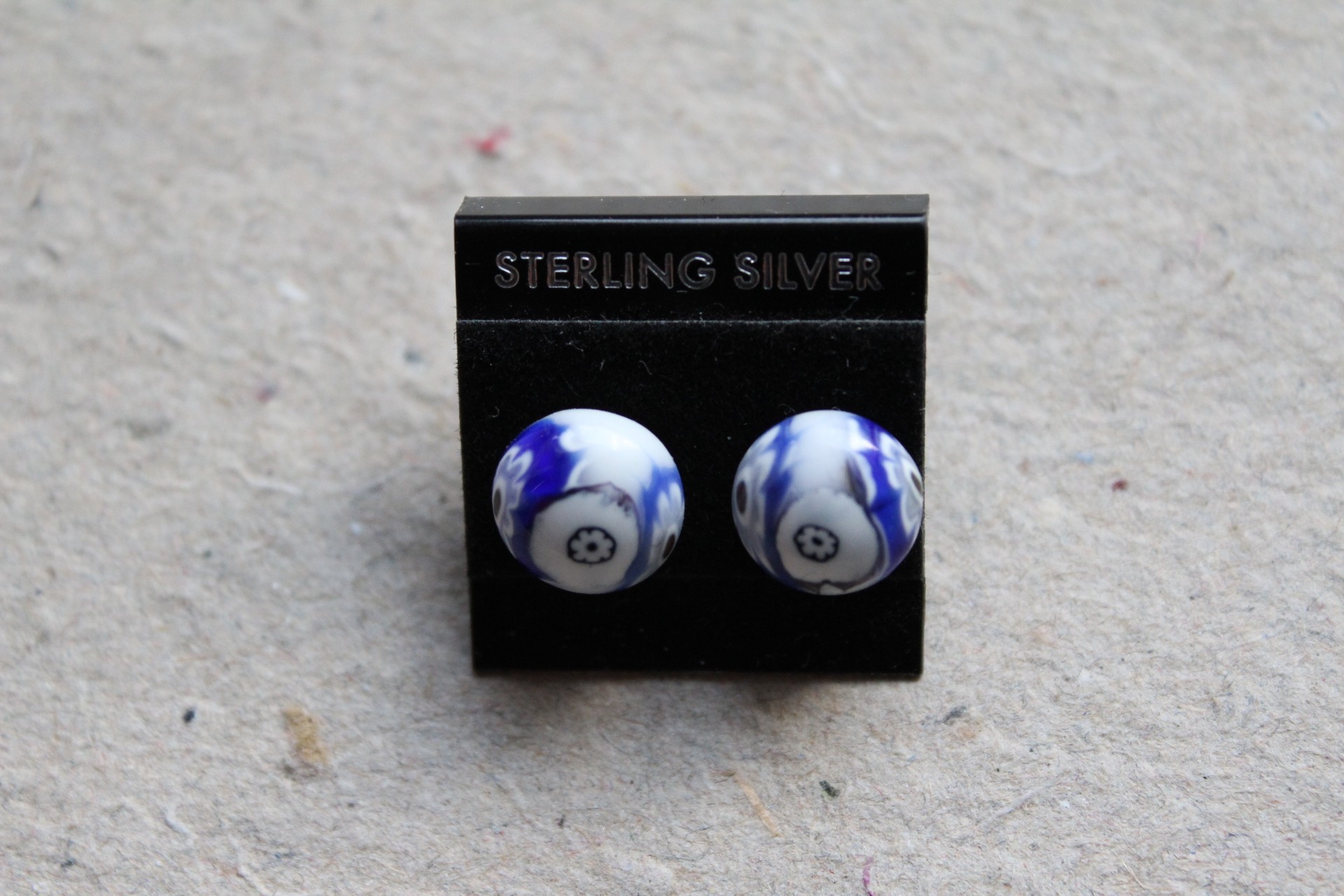 Blomst i hvid og flere blå nuancer på hvid bund, ørestikker i sterling sølv.