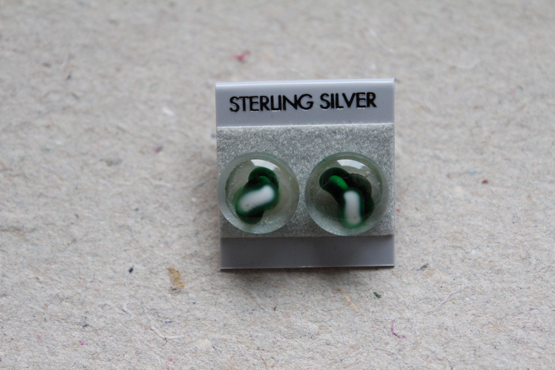 Mønster i hvid og grønne nuancer indsmeltet i klart glas, ørestikker i sterling sølv.