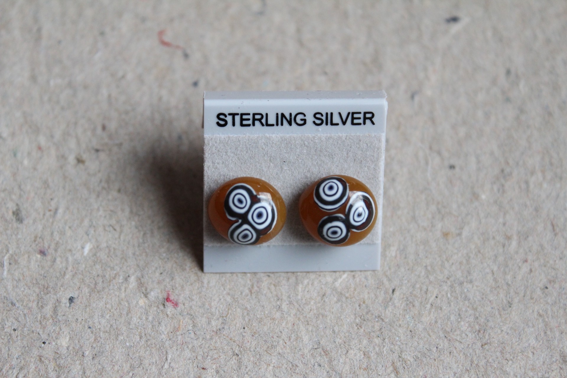 Cirkel mønster i hvid og brun på mørk karry gult glas, ørestikker i sterling sølv.