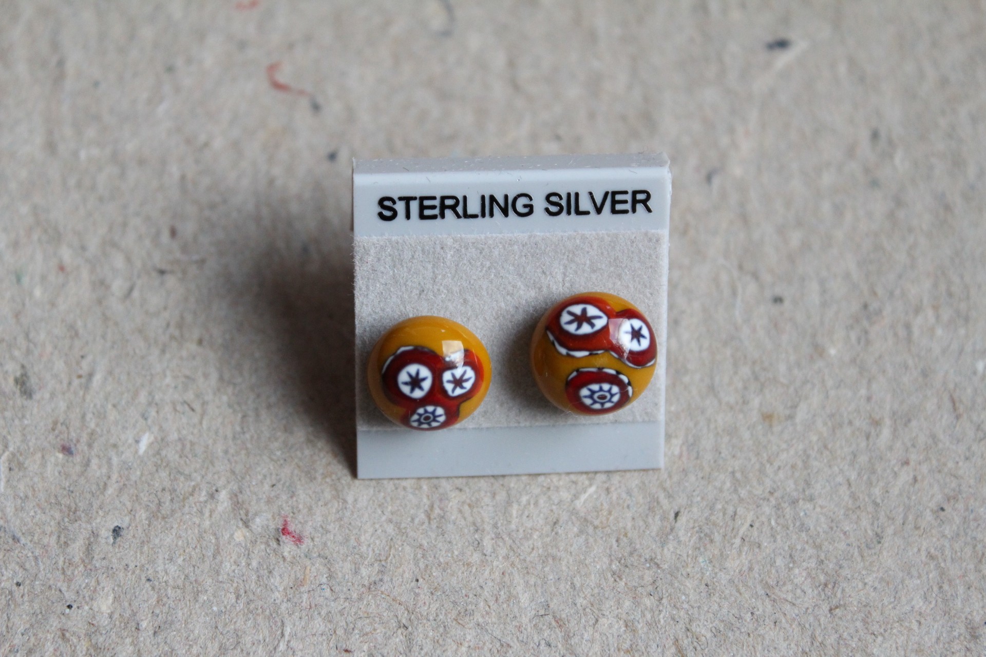 Stjerne mønster i hvid og rødbrun på karry gult glas, ørestikker i sterling sølv.