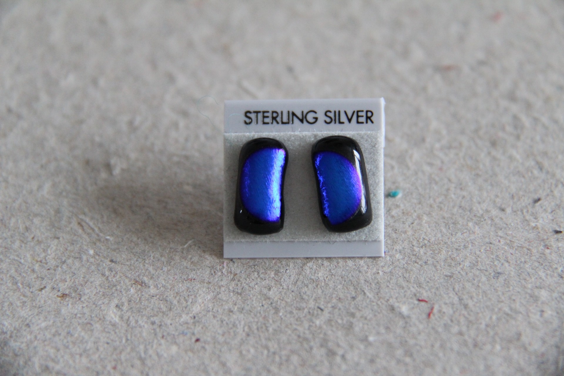 Aflang firkant med glimtende koboltblå i halv cirkel på sort bund, ørestikker i sterling sølv.