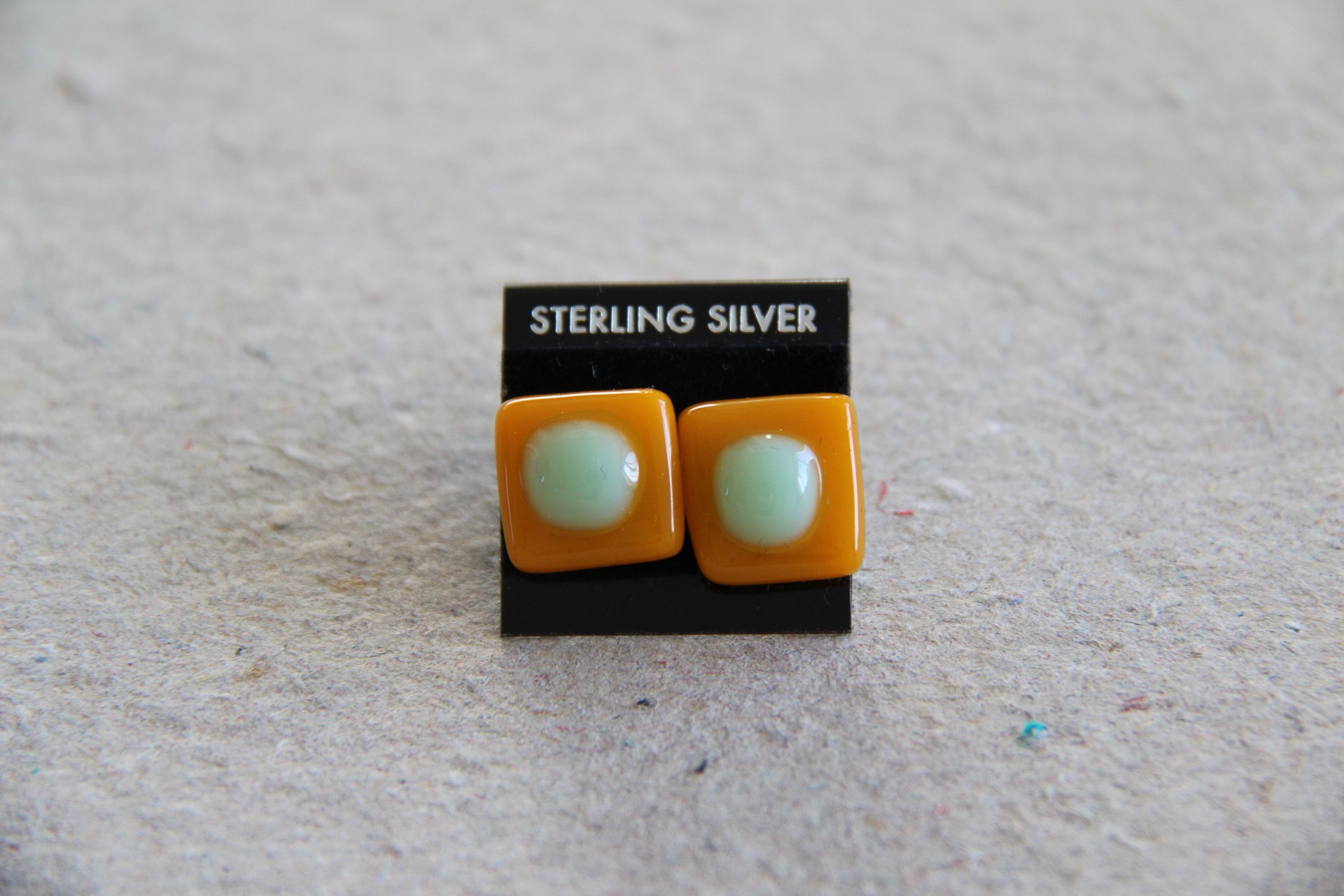 Orange firkant med stor prik i lys mint. Ørestikker i sterling sølv