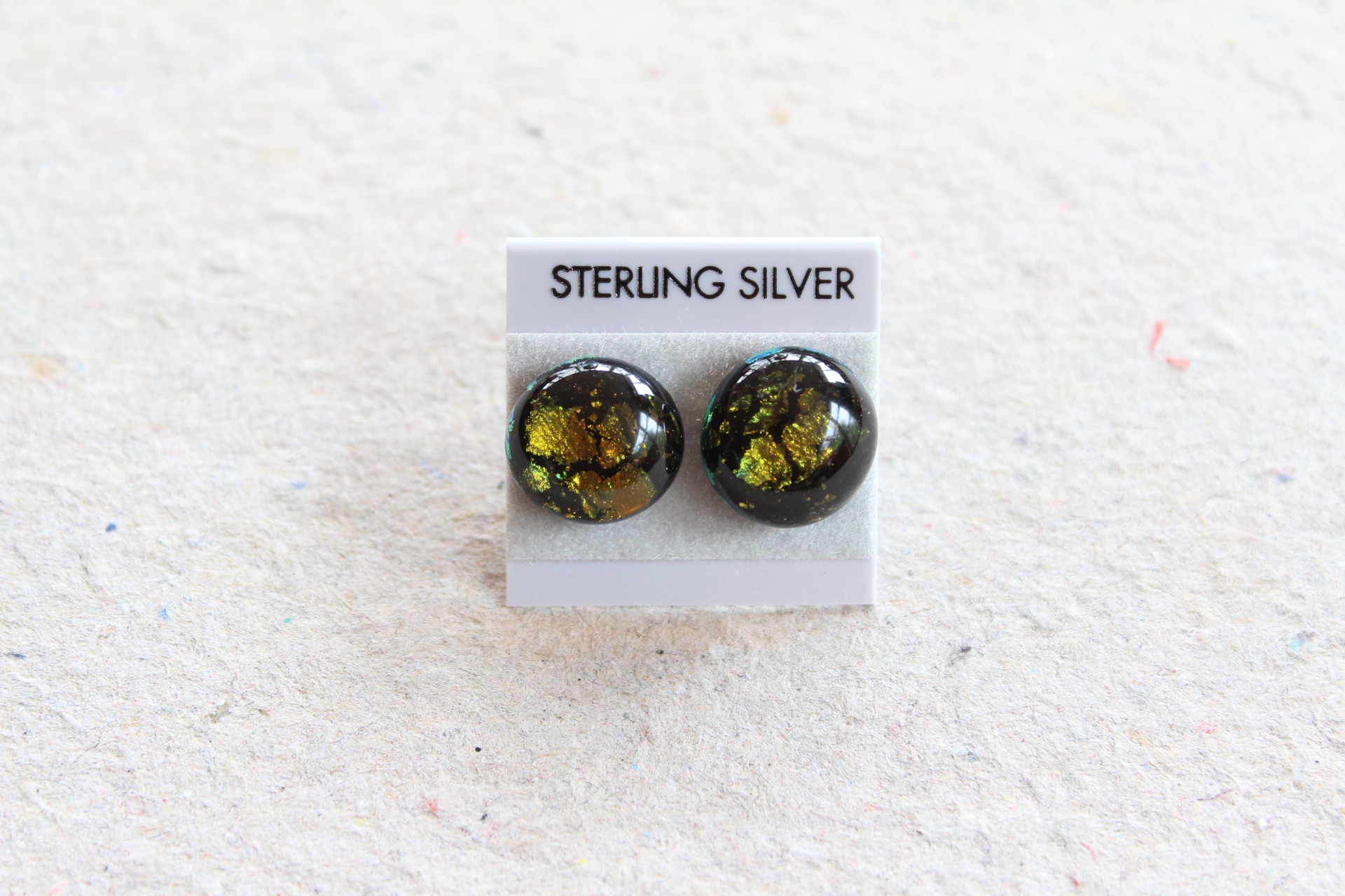 Glimtende kobber overtrukket med klar gul på sort bund, ørestikker i sterling sølv