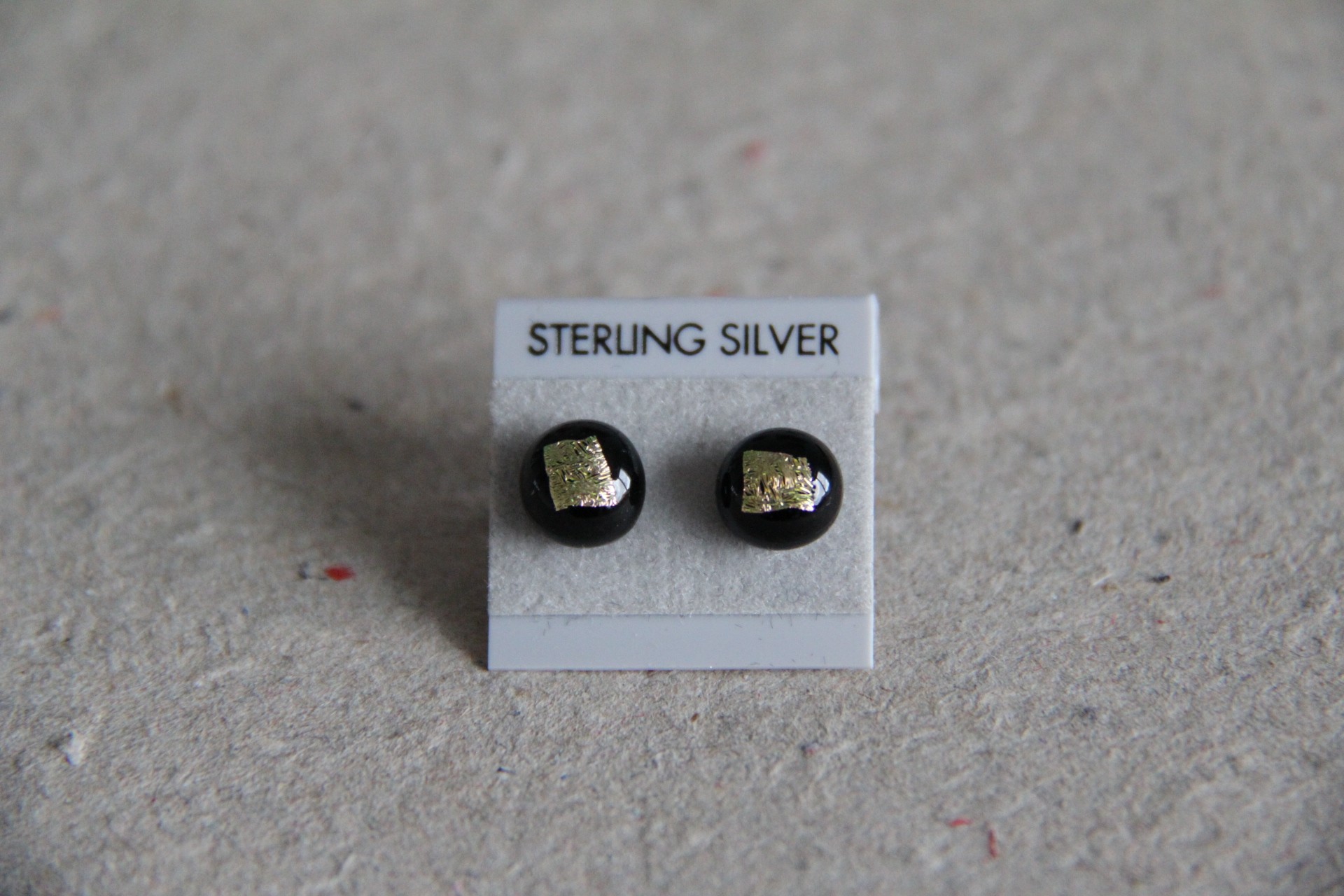 Firkantet, glimtende lys gylden på sort bund, ørestikker i sterling sølv