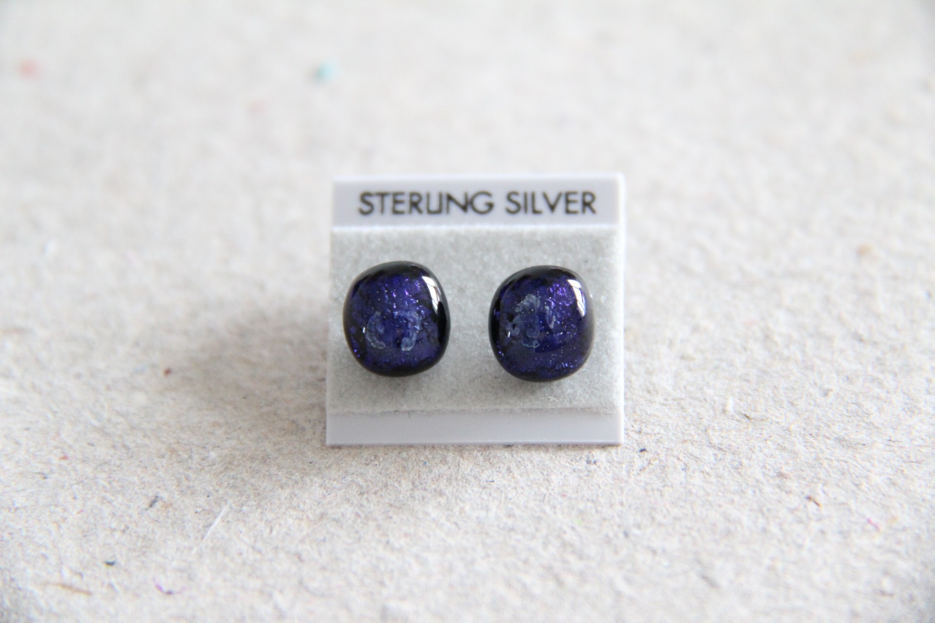 Glimtende blå og lilla med sølvgrå aftegninger under klart glas med dybdeeffekt på sort bund, ørestikker i sterling sølv
