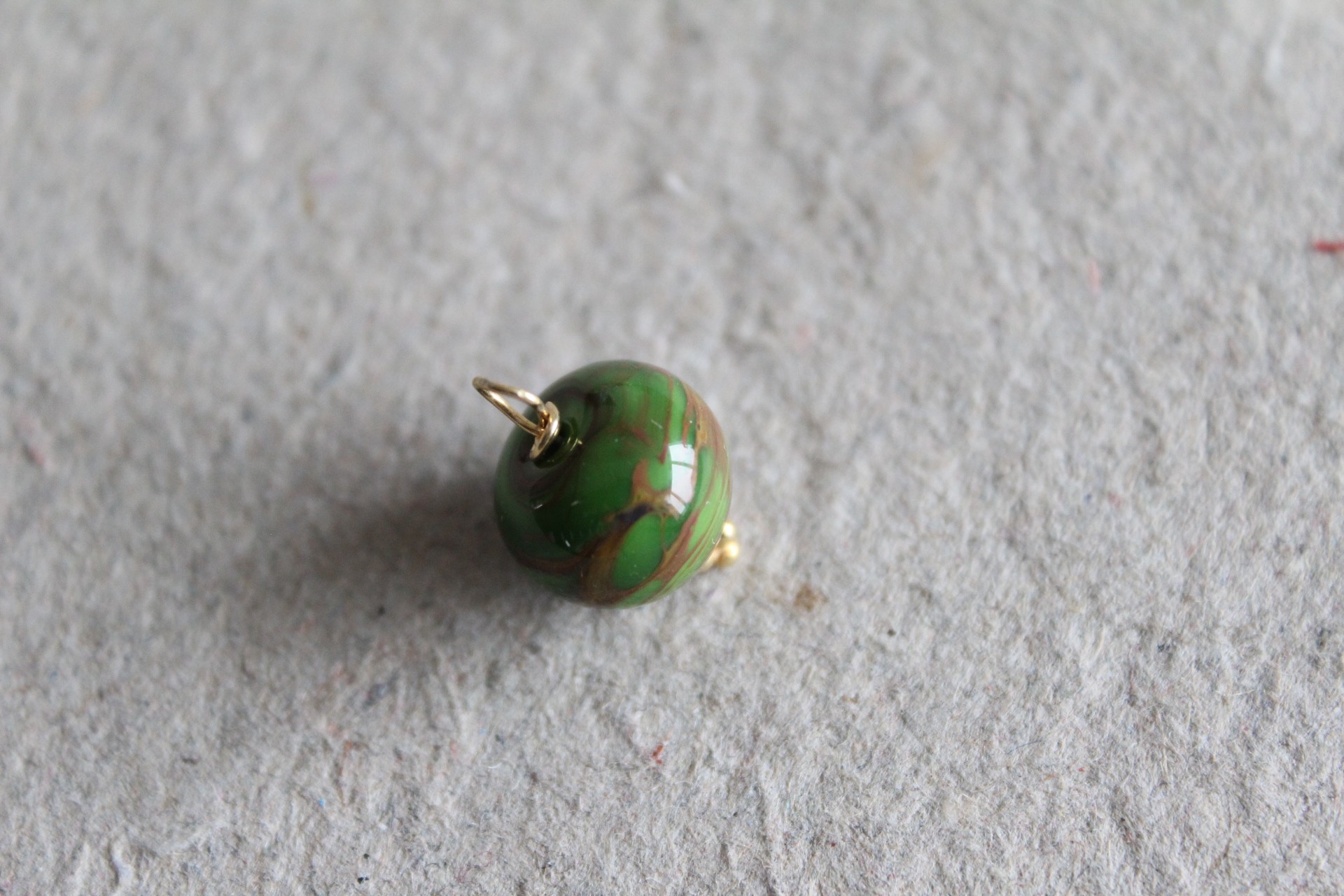 Græsgrøn perle med beige-brune aftegninger og øje i sterling sølv forgyldt med finguld.