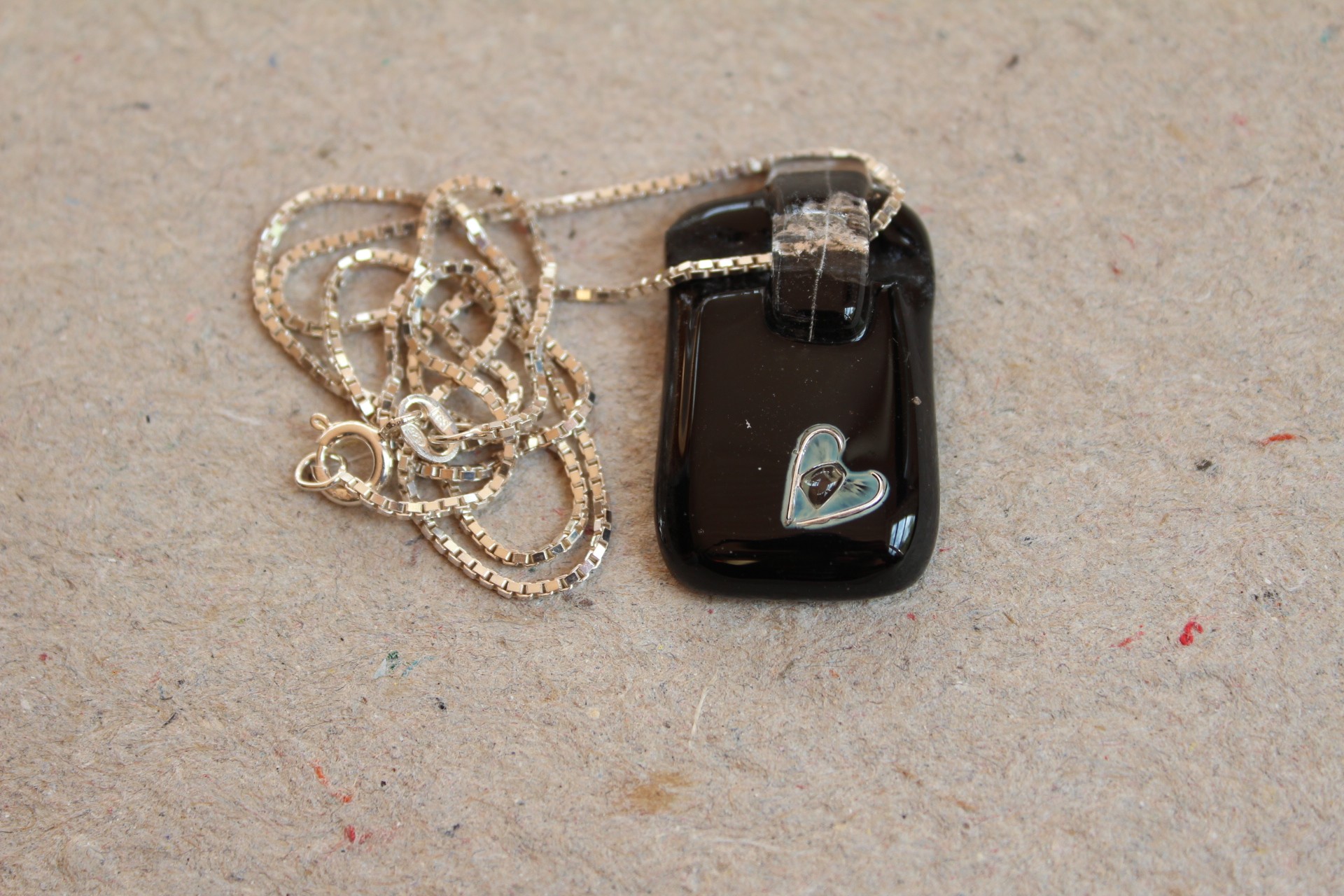 Veneziakæde i sterling sølv, 42 cm. Glassmykke i sort med klart glas og indsmeltet hjerte i sterling sølv.