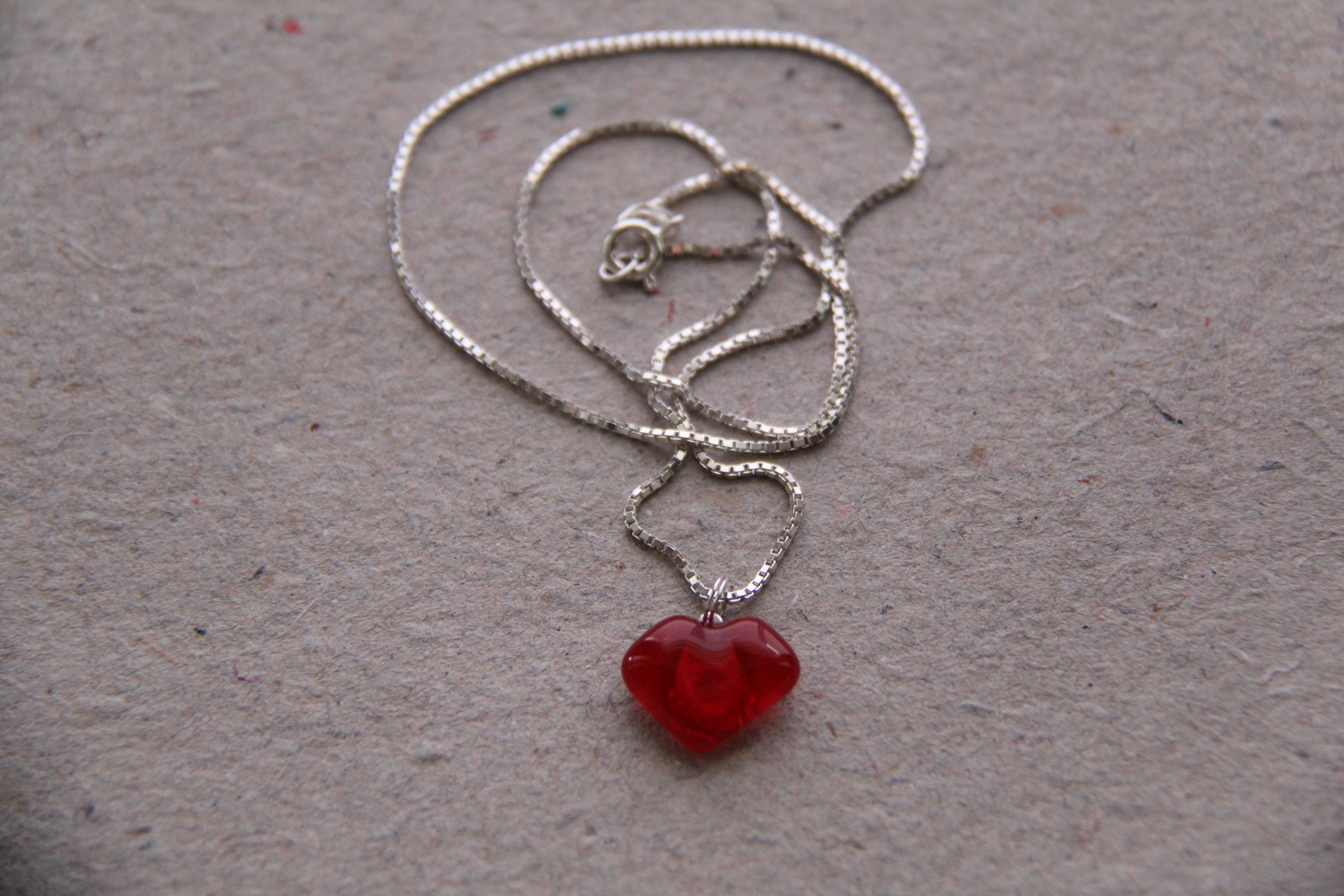 Veneziakæde i sterling sølv, 42 cm. Glassmykke i hjertefacon i klar rød.